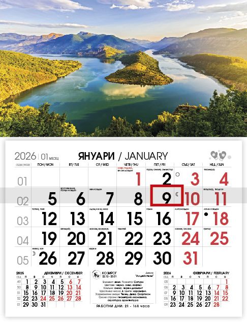 Разгънат формат:42 x 32 cm.Тяло: 12 листа (месеца),финландски офсет,печат. 2 цвята - черен -червен, 2 езика.С прозорче