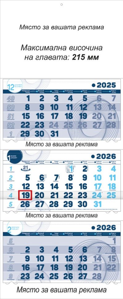 Начало Продукти за реклама Стенни и настолни календари Стенен работен календар КС Макси, 3-секционен, СИН