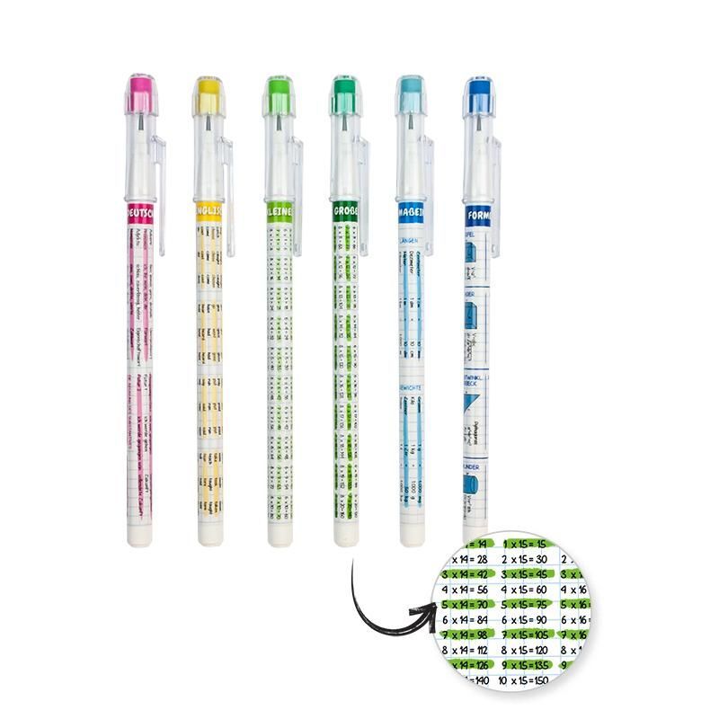 Молив с мини графити. Тяло в 6 различни теми: - таблица за умножение 1 - 10 - таблица за умножение 11 - 20 - немски език - английски език - мерни единици - математически формули