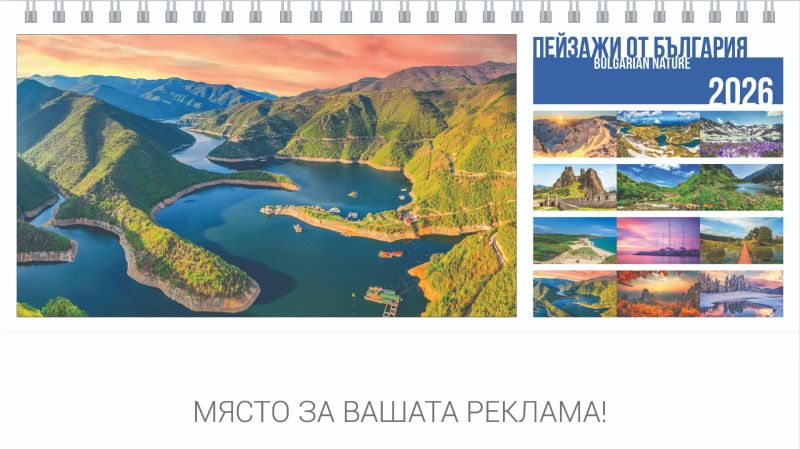 Тяло: 24 х 10 cm, 12 листа (месеца) двустранен хром гланц, цветност: 4+0. Отбелязани празници и имени дни, седмици. Подложка: 24 x 13.8 cm, 300 g/m2 бял опаковъчен картон Захващане: със спирала Рекламна площ върху основата: 24 x 3.5 cm Тяло: 24 х 10 cm, 12 листа (месеца) двустранен хром гланц, цветност: 4+0. Отбелязани празници и имени дни, седмици. Подложка: 24 x 13.8 cm, 300 g/m2 бял опаковъчен картон Захващане: със спирала Рекламна площ върху основата: 24 x 3.5 cm