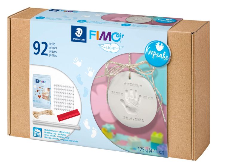 * комплект Fimo Air, подходящ за начинаещи и любители* изключително лесно създаване на прекрасни уникални предмети* грънчарство без необходимост от пещ* гладка консистенция* готовите модели могат да бъдат модифицирани (пилени, шлифовани, пробивани,боядисвани, лакирани)* съдържание: глина за моделиране FIMOair light 125 gбяла, 1 инструмент за моделиране, 1 връв от юта, 1 комплект печати с 88 знака