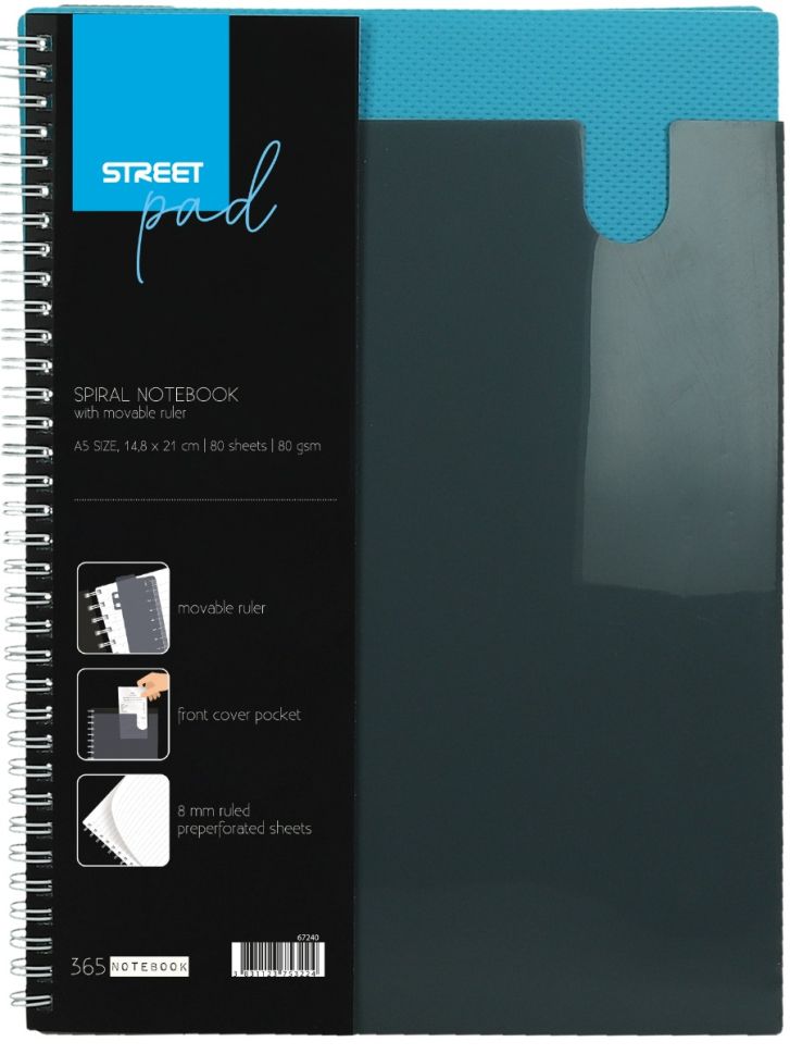 Спирала тип гребен. Микроперфорация. PP корица 0.7 mm. Подвижна линийка, Джоб на корицата. Варианти син и черен.