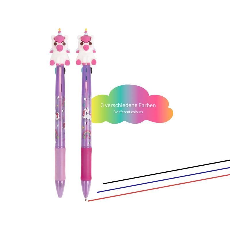 Химикалка с дизайн на еднорог, включваща ефектен печат и три различни цвята- черен, син, червен за писане, рисуване и драскане. Меката гума на дръжката осигурява удобно писане. Предлага се в двете разновидности на розовото- светло и по-тъмно. Размери: 1x 1 x 17,6 cm