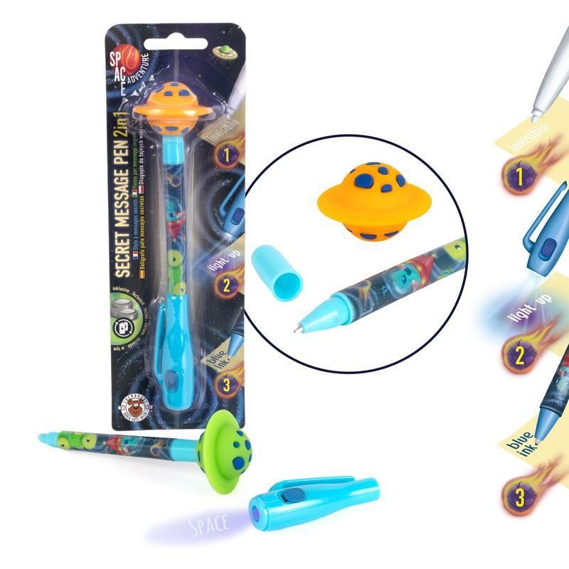 2в1 - галактически страхотна писалка! С тази писалка можете да пишете тайни съобщения невидимо и те стават видими едва когато се активира UV светлината на капачката и се освети хартията. Така малките и големи тайни винаги остават скрити! Сините химикалки също позволяват да рисувате и да пишете бележки. Включва подменяеми батерии: 3 x LR41. Налични в 2 различни версии: зелена, оранжева. Дължина на писалката: приблизително: 16,0 см Размери на продукта с опаковката 6,8 см x 3,5 см x 20,2 см
