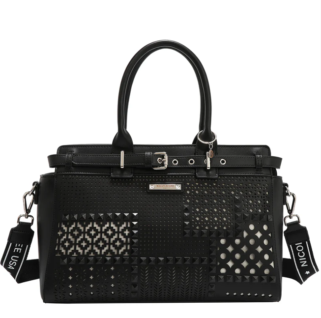 Външна част от висококачесвена еко кожа. Двойно заоблени горни дръжки, включва автентичен медальон Nicole Lee с кръгла форма . Затваряне с цип. Декориран отпред с мотиви. Декоративен колан отпред. Дъно с метални крачета за по-голяма защита. Заден джоб с цип. Метални детайли. Гравирана плоча с лого. Ципове с гравирано лого Странични D-пръстени. Подплата от полиестер. Вътрешен заден джоб с цип, плоча с лого и каишка за ключове. Два вътрешни джоба за смартфон и портфейл. Регулируема и премахваща се презрамка с гравирано лого. Размери: 41 x 25 x 15 cm