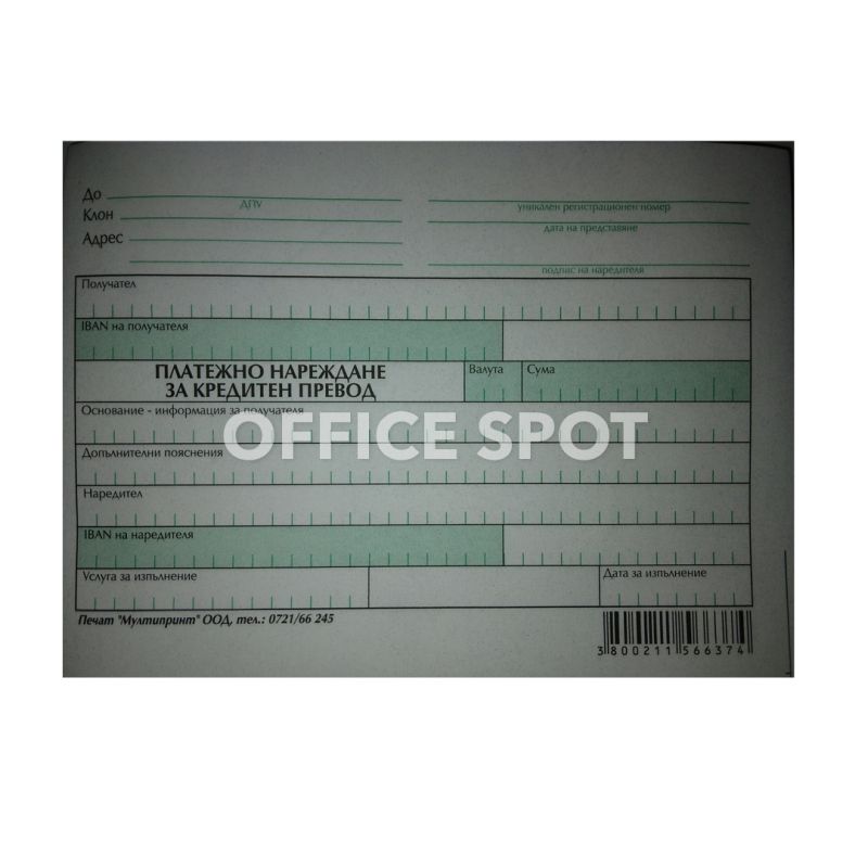 Платежно нареждане за кред.превод, хим, 100л IBAN