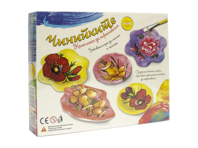 Креативен арт комплект за декорация.Съдържа: 3 керамични чинийки, палитра с 6 цвята и четка.
